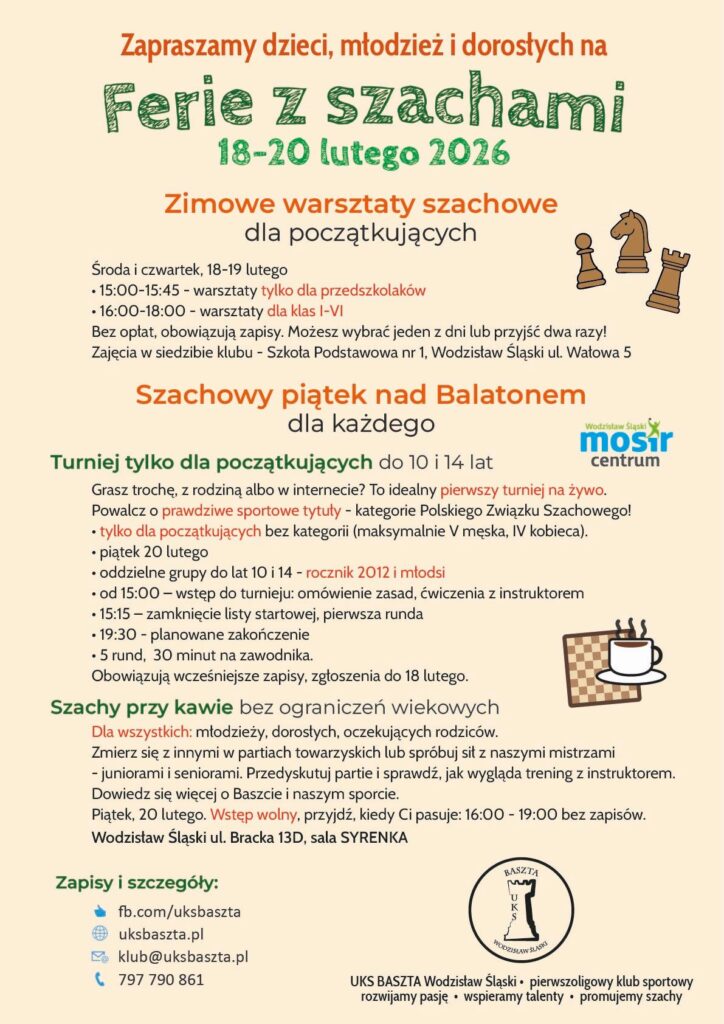W pierwszym tygodniu ferii zapraszamy na szachowe wydarzenia dla każdego – od przedszkolaka po dorosłych ☕👇